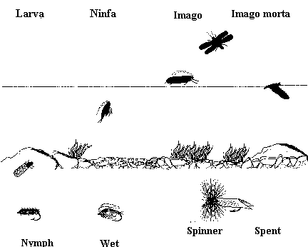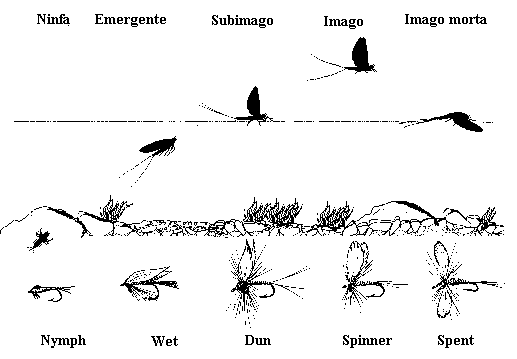 Ecco il ciclo di ​vita dei tre principali tipi di mosche per la pesca a mosca, da sinistra